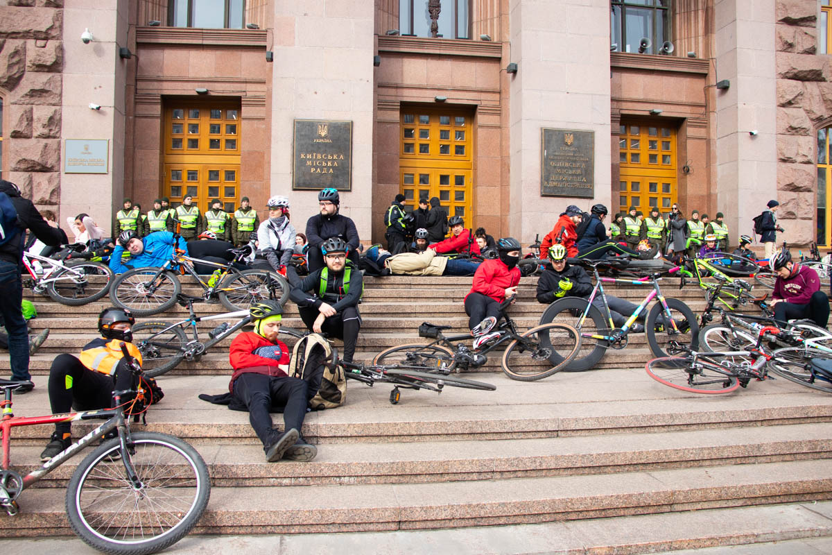 Уточняется, что активисты протестовали лежа, на одном из плакатов было написано "Хватит нас убивать". Собравшиеся под КГГА активисты требовали у городских властей улучшения условий для велосипедистов - ограничить скорость передвижения по городу до 50 километров в час и все-таки начать тендеры на строительство семи веломаршрутов по Киеву.