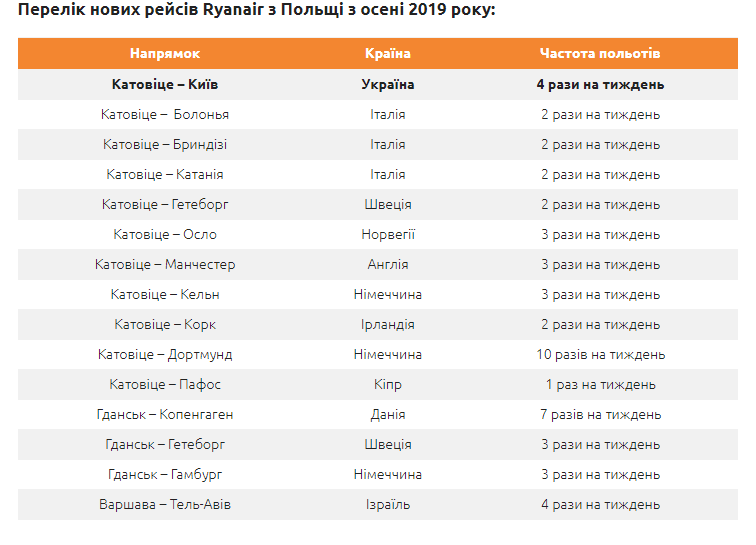 Авиакомпания Ryanair объявила о запуске 11 новых рейсов из польского города Катовице осенью 2019, среди кторых нашлось место и для Украины. С 30 октября ирландский лоукостер откроет рейс Киев - Катовице, пишет "Лоукост авиа".