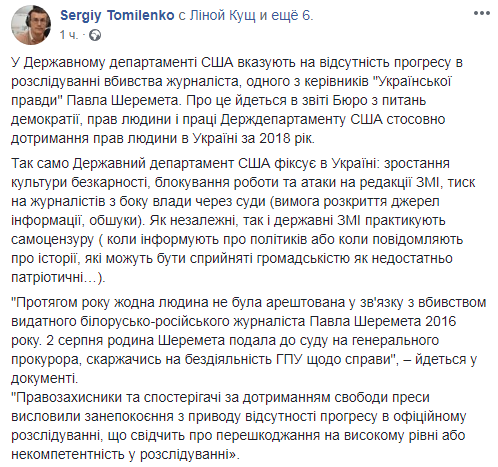 Он уточняет, что в отчете Госдеп указывает на отсутствие прогресса в расследовании убийства журналиста, одного из руководителей "Украинской правды" Павла Шеремета. Кроме того, в отчете зафиксирован рост культуры безнаказанности, блокирование работы и атаки на редакции СМИ, давление на журналистов со стороны власти через суды (требование раскрытия источников информации, обыски). Как независимые, так и государственные СМИ практикуют самоцензуру (когда информируют о политиках или когда сообщают об историях, которые могут быть восприняты общественностью как недостаточно патриотические...).