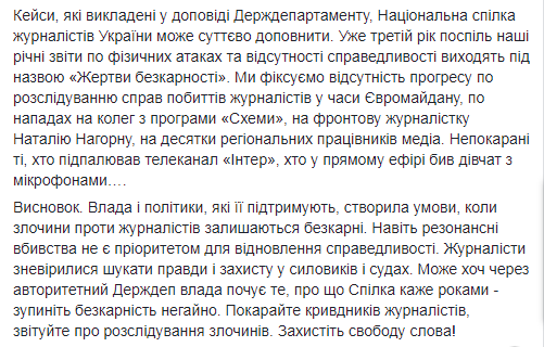 "Кейсы, изложенные в докладе Госдепартамента, Национальный союз журналистов Украины может существенно дополнить. Уже третий год подряд наши годовые отчеты по физическим атаках и отсутствия справедливости выходят под названием "Жертвы безнаказанности". Мы фиксируем отсутствие прогресса по расследованию дел избиений журналистов во времена Евромайдана, по нападениям на коллег из программы "Схемы", на фронтовую журналистку Наталью Нагорную, на десятки региональных работников СМИ. Не наказаны те, кто поджигал телеканал "Интер", кто в прямом эфире бил девушек с микрофонами...", - пишет Томиленко.
