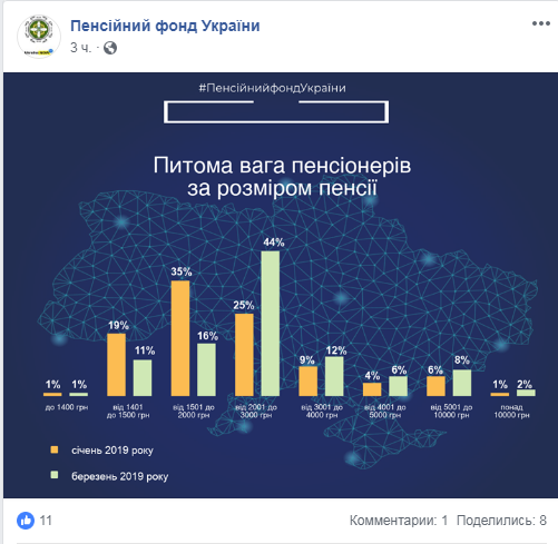 По состоянию на 1 марта 2019 года, уже после повышения пенсий, большинство граждан Украины получают выплаты до 3 тыс. грн. Об этом сообщает пресс-служба Пенсионного фонда Украины.