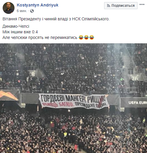 "Убийц много, президент один". На матче Динамо - Челси ультрас развернули баннеры о коррупции и деле Гандзюк
