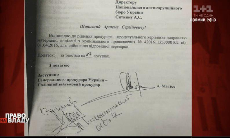 "Руководство НАБУ приняло эти документы, но жуликам за это не было ничего. Однако мы вычислим всех предателей, в том числе в НАБУ", - сказал Луценко и показал документ за подписью Сытника, что он получил эти 87 страниц (см. скриншот).