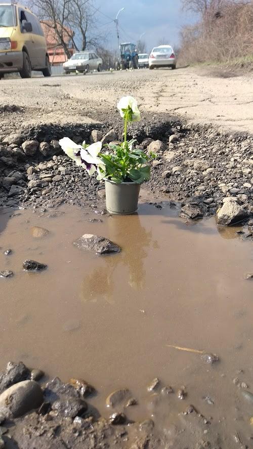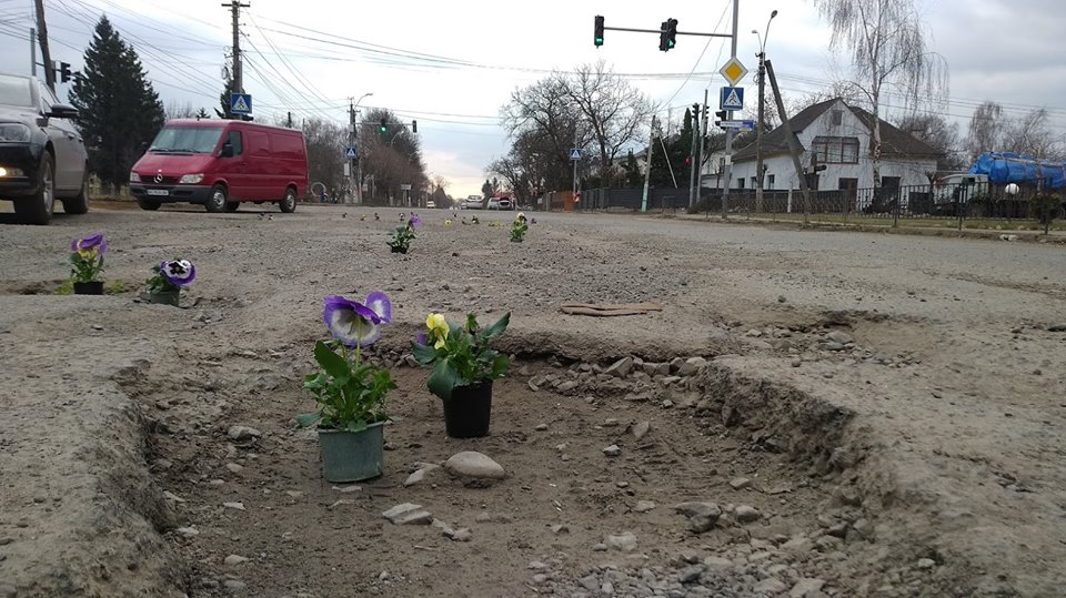 На Закарпатье к приезду Порошенко устроили флешмоб с цветами в дорожных ямах. Фото