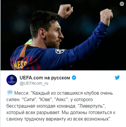 Перед началом жеребьевки Месси высказался о силе команд. "Каждый из оставшихся клубов очень силен. Сити, Юве, Аякс, у которого бесстрашная молодая команда, Ливерпуль, который всех разрывает. Мы должны готовиться к самому трудному варианту из всех возможных", - заявил великий футболист официальному Twitter УЕФА.