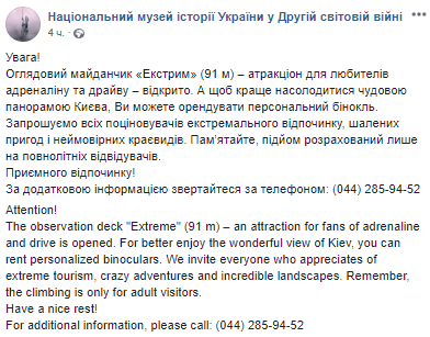 "Смотровая площадка "Экстрим" (91 м) - аттракцион для любителей адреналина и драйва – открыта. А чтобы лучше насладиться великолепной панорамой Киева, вы можете арендовать персональный бинокль", - говорится в сообщении на странице в соцсети Национального музея истории Украины во Второй мировой войне, на территории которого расположен монумент.