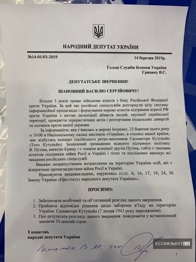 Депутаты Верховной Рады подготовили обращение к главе Службы безопасности Украины Василию Грицаку с предложением запретить въезд итальянского певца Тото Кутуньо в Украину