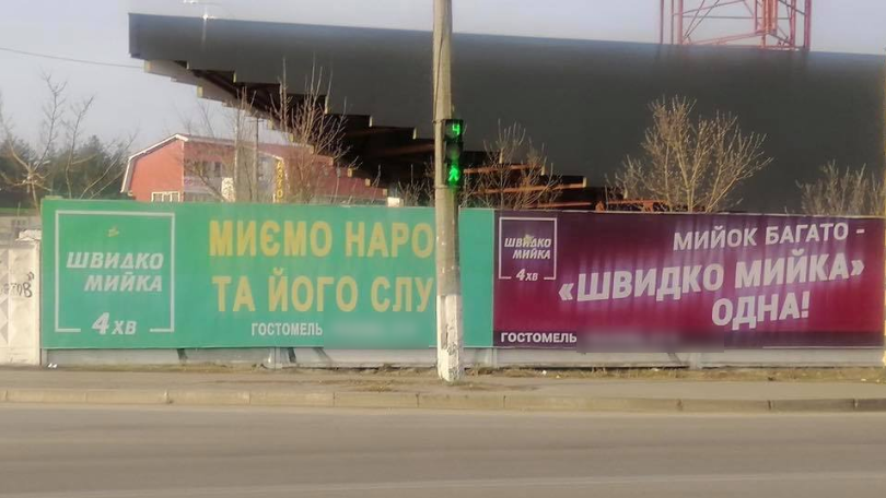 На снимке запечатлены два рекламных баннера "Швидко мийки". На первом из них - слоган: "Моем народ и его слугу", на втором - "Моек много - "Швидко мийка" одна". Так, один из баннеров отсылает к предвыборной агитации кандидата в президенты Владимира Зеленского, второй обыгрывает борды Петра Порошенко.