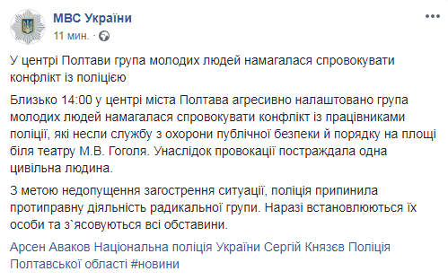 Ранее на митинге в Киеве представители Нацкорпуса заявили, что в Полтаве пострадали их активисты.
