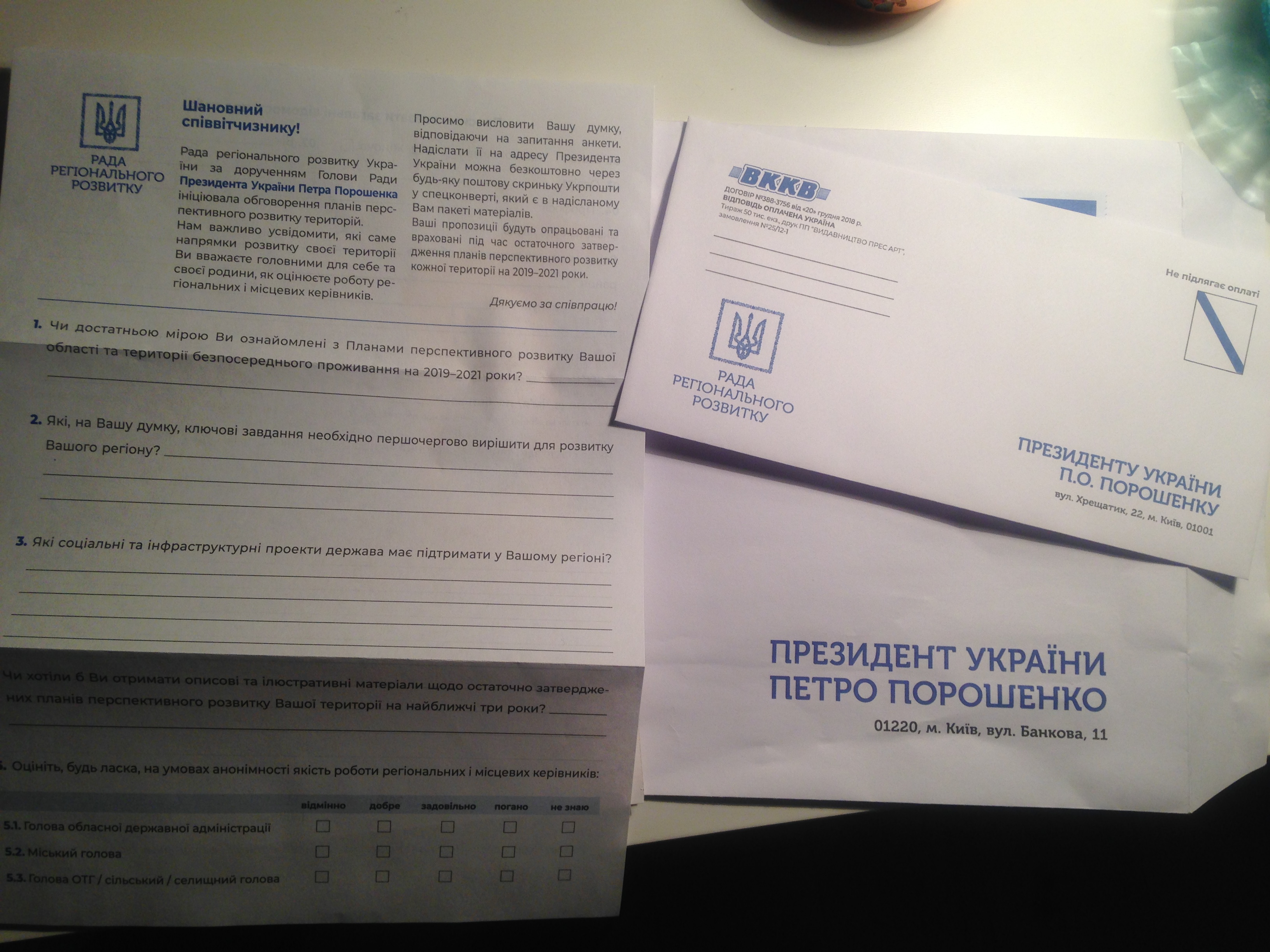 На такие встречи в том числе приглашают получателей писем от Совета регионального развития в регионах, главой которого является Порошенко. В таких посланиях украинцам предлагают ответить на несколько вопросов касаемо развития регионов и отослать ответ президенту.