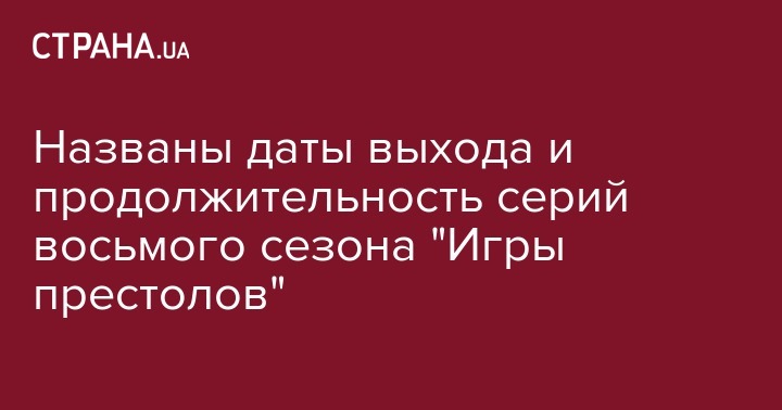 "HBO подтвердил, что первые два эпизода восьмого и последнего сезона "Игры престолов" будут немного короче остальных. По слухам, последние шесть эпизодов популярнейшего сериала длились по 90 минут каждый, но теперь стало ясно, что только последние четыре эпизода будут длиннее, чем обычно. Телеканал также обнародовал даты дебюта для каждого из последних эпизодов", - сказано в сообщении.