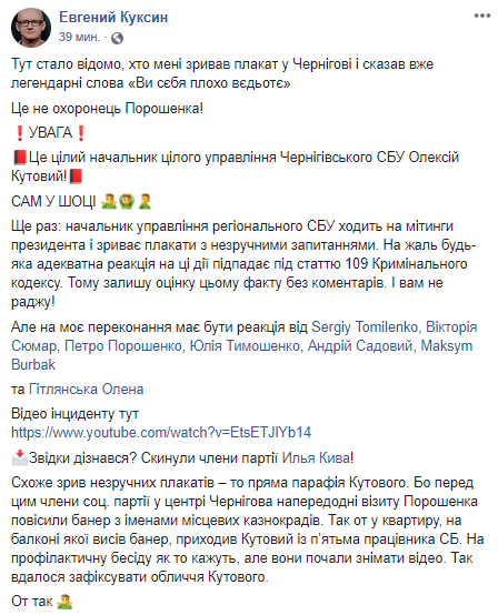 "Похоже срыв неудобных плакатов - это прямая парафия Кутового. Потому что перед этим члены социалистической партии в центре Чернигова накануне визита Порошенко повесили баннер с именами местных казнокрадов. Так вот в квартиру, на балконе которой висел баннер, приходил Кутовой с пятью работника СБУ. На профилактическую беседу как говорится, но они начали снимать видео. Так удалось зафиксировать лицо Кутового", - добавил Куксин.