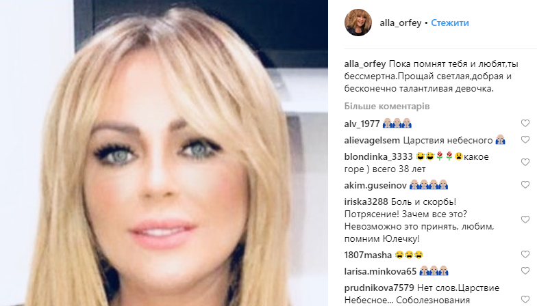 "Юлечка... Ну как же так... Добрая, красивая,талантливая, сложно поверить... Слов нет... в голове не укладывается... Соболезнования родным и близким...",- написала в сети она.
