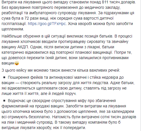 "Лишь через некоторое время, когда у мальчика начались проблемы с дыханием, родители обратились за медицинской помощью. Чтобы спасти ребенка нужно было 57 дней стационарной помощи, включая 47 дней в отделении интенсивной терапии. Лишь на 44 день мальчик смог дышать самостоятельно. Через месяц после стационарной реабилитации он вернулся к своей обычной жизни. Расходы на лечение составили более 811 тысяч долларов - без учета воздушной перевозки в медицинское учреждение, реабилитации и амбулаторного сопровождения лечения. По подсчетам эта сумма была в 72 раза больше, чем средняя сумма стоимости детской госпитализации. Хотя болезнь можно было предотвратить прививкой", - отметила Ульяна Супрун.