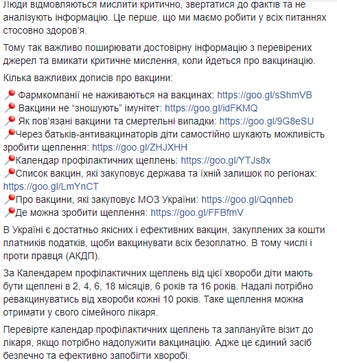 "Такую прививку можно получить у семейного врача. Проверьте календарь профилактических прививок и запланируйте визит к врачу, если нужно наверстать вакцинацию. Ведь это единственное средство безопасно и эффективно предотвратить болезнь", - советует глава украинского Минздрава.