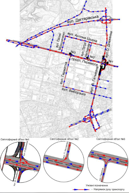 Улица Вадима Гетьмана. Если вы едете по улице Вадима Гетьмана, то здесь поток из трех рядов переходит в два и перед мостом уходит на съезд. Дальше - перекресток с проспектом Победы. Важно: согласно знакам, поворота налево, на проспект, чтобы ехать в сторону Святошино нет, но водители нарушают массово. Нет левого поворота и дальше, на ул. Антона Цедика (Эжена Потье, мимо завода "Росинка"), необходимо ехать аж до следующей развязки. Однако многие нарушают, несмотря даже на пост полиции здесь. Кстати, в будущем схему движения обещают доработать.