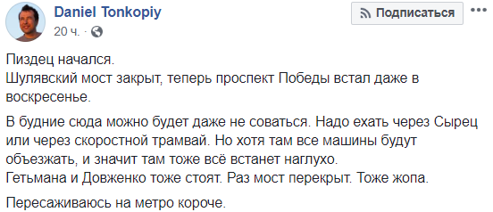 "Шулявский мост перекрыт! Ремонт начался! Да здравствует 1.5 года апокалипсиса!", - пишет чиновник Нацрады по телерадиовещанию Александр Глущенко.