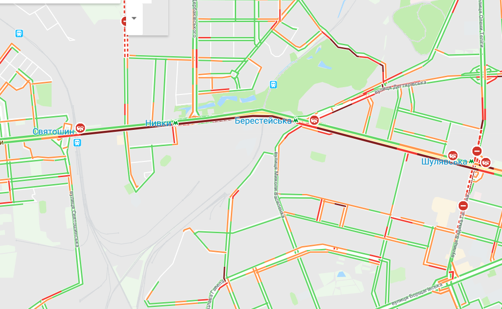 На утро понедельника проспект Победы "стоит" от метро Святошино до Шулявки - собственного, того места, где еще полтора года будет идти ремонт.