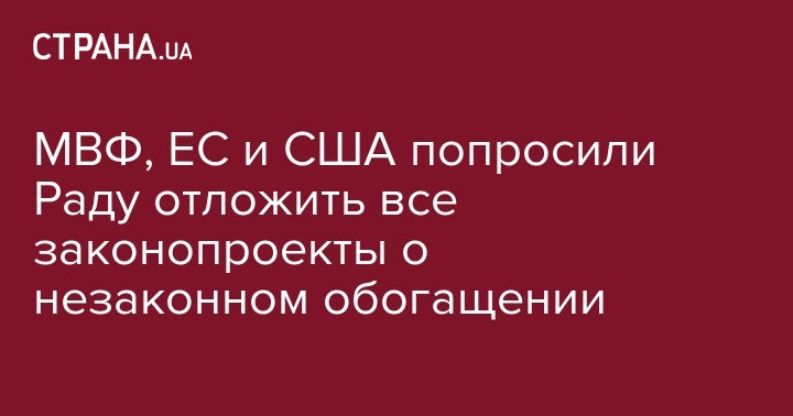 От лица МВФ, посла США и главы представительства Европейского Союза в Украине в профильный комитет Рады поступило письмо с просьбой отложить рассмотрение всех 13 законопроектов об уголовной ответственности за незаконное обогащение. Причиной переноса называется несовершенство всех поданных законодательных инициатив.