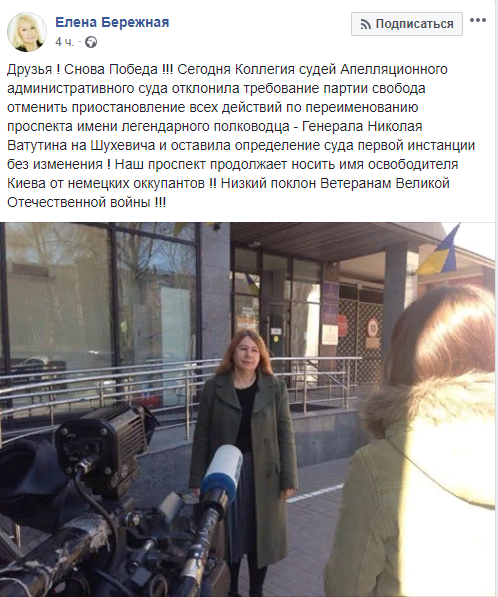 "Друзья ! Снова Победа !!! Сегодня Коллегия судей Апелляционного административного суда отклонила требование партии свобода отменить приостановление всех действий по переименованию проспекта имени легендарного полководца - Генерала Николая Ватутина на Шухевича и оставила определение суда первой инстанции без изменения ! Наш проспект продолжает носить имя освободителя Киева от немецких оккупантов !! Низкий поклон Ветеранам Великой Отечественной войны, - написала она.