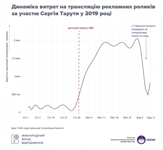 Со дня регистрации до 10 марта центральные телеканалы показали почти 1800 роликов Таруты, стоимость которых, согласно с расценками телеканалов, достигает 62 млн гривен.