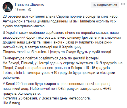 В среду, 20 марта, антициклон Hannelore охватит всю континентальную Европу и подарит ее жителям солнце и синее небо, а вот в Украине обстановку подпортит циклон Igor. Об этом написала синоптик Наталья Диденко на своей странице в Facebook.