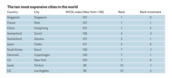 В целом первая десятка самых дорогих городов выглядит так (в порядке убывания): Сингапур, Париж, Гонконг, Цюрих, Женева, Осака, Сеул, Копенгаген, Нью-Йорк, Тель-Авив, Лос-Анджелес.