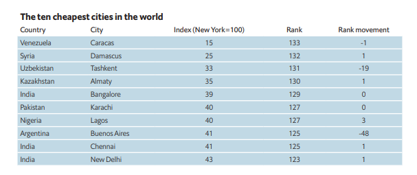 Десятка самых дешевых городов мира выглядит следующим образом: Кракас, Дамаск, Ташкент, Алма-Ата (Казахстан), Бангалор (Индия), Карачи (Пакистан), Лагос (Нигерия), Буэнос-Айрес (Аргентина), Ченнаи (Индия), Нью-Дели (Индия).
