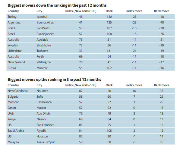 Также опубликованы названия тех городов, которые сильнее всего опустились или поднялись в рейтинге. Оказалось, что наибольшие падения случились со Стамбулом и Буэнос-Айресом. Они опустились на 48 пунктов каждый. Впрочем, значительно снизился рейтинг Ташкента - на 19 пунктов, а также Москвы - на 16 пунктов. Российская столица заняла 102 место в списке и покинула мировой топ-100.