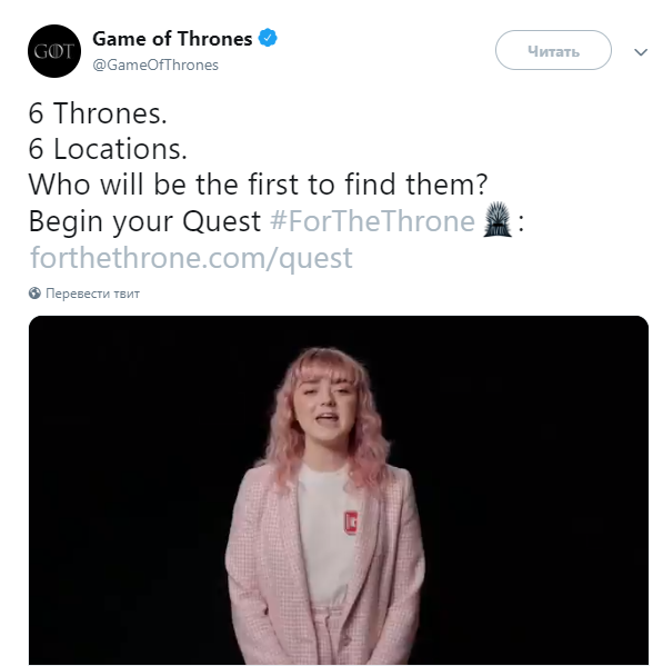 После того, как истечет время, или кто-нибудь обнаружит первый трон, HBO выложит видео с новой локацией. Этот квест - часть промо-кампании грядущего сезона #ForTheThrone (За трон). Канал спрашивает фанатов, на что они готовы пойти ради железного трона. Помимо квеста, поклонникам также предлагается "пролить кровь" и "творить".