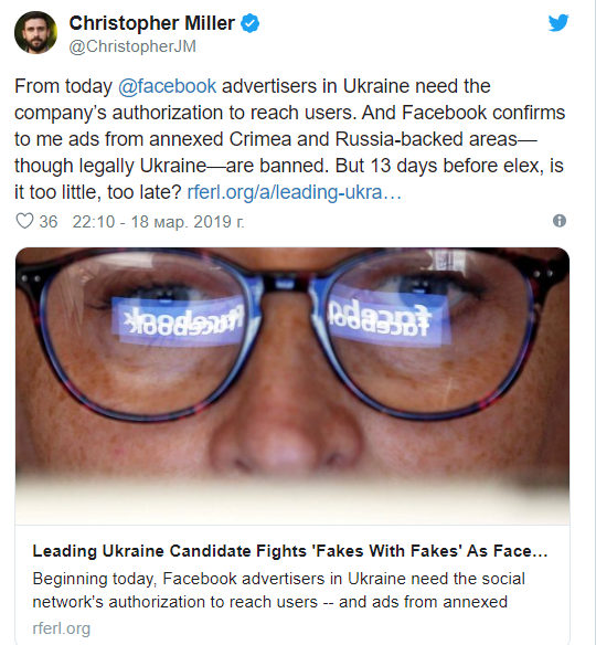 Отметим, что нововведения стартовали за 13 дней до выборов президента Украины. Миллеру также подтвердили в Facebook, что посты с аннексированного Крыма и областей, поддерживаемых Россией, банятся, хотя оккупированные территории официально признаны украинскими.