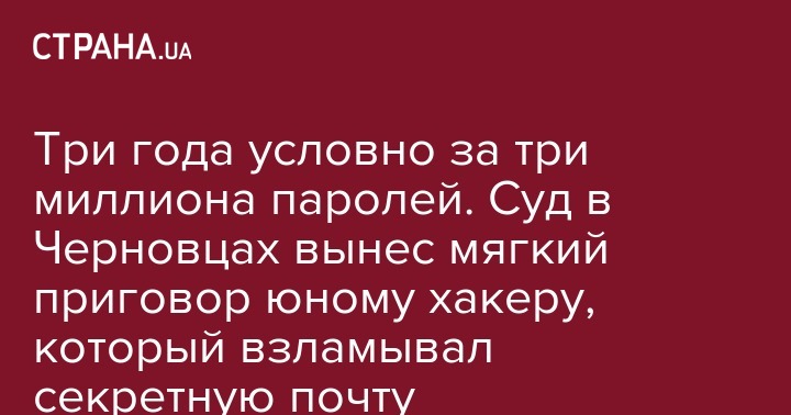 Суд в Черновцах приговорил несовершеннолетнего хакера к трем годам тюрьмы условно за взлом чужих компьютеров и продажу 3 миллионов паролей к электронным почтовым ящикам, многие из которых хранили секретную информацию.