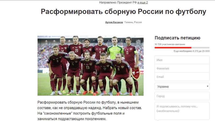 "Расформировать сборную России по футболу в нынешнем составе как не оправдавшую надежд. Набрать новый состав. На "сэкономленные" средства построить футбольные поля и заниматься подрастающим поколением", - говорится в петиции.