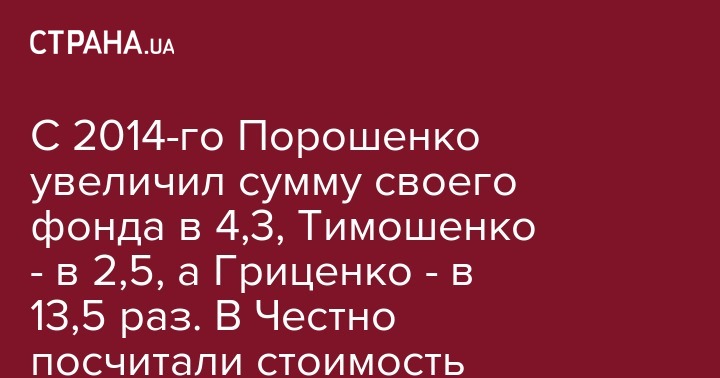 Так, сообщается, что в 2014 году размер избирательного фонда Петра Порошенко составлял 96,5 миллиона гривен, а в этом - 415,5 миллиона, Юлии Тимошенко - 67 млн и 164 млн соответственно, фонд Анатолия Гриценко составлял 7,5 миллиона, в этом году он вырос до 101 млн. При этом финансовые отчеты кандидатов содержат информацию о вкладах и расходах только до 18 марта включительно.