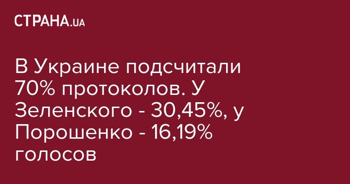 В Украине подсчитали 70% протоколов. У Зеленского - 30,45%, у Порошенко - 16,19% голосов
