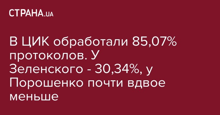 По итогам обработки 85,07% протоколов Центральной избирательной комиссией лидером президентских выборов сохраняется Владимир Зеленский с 30,34% голосов пришедших на выборы. При этом разрыв между идущем на втором месте Петром Порошенко и Юлией Тимошенко сократился до 2,72%.