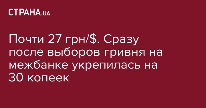 Почти 27 грн/$. Сразу после выборов гривня на межбанке укрепилась на 30 копеек