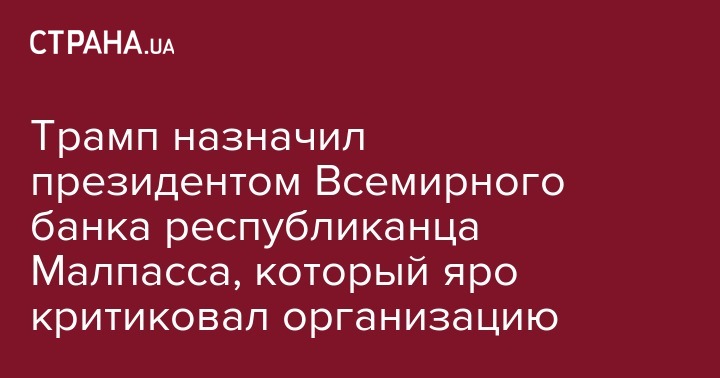 Президент САШ Дональд Трамп назначил на должность президента Всемирного банка члена республиканской партии США и замминистра финансов по иностранным делам Дэвида Малпасса, который критиковал организацию за негибкость и навязчивость. Об этом сообщает BBC.