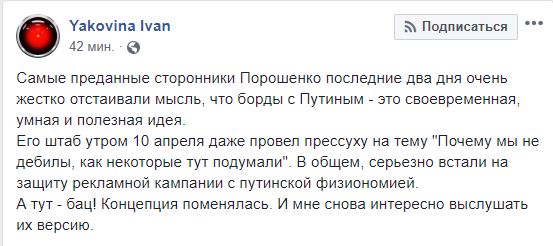 "Самые преданные сторонники Порошенко последние два дня очень жестко отстаивали мысль, что борды с Путиным - это своевременная, умная и полезная идея. Его штаб утром 10 апреля даже провел прессуху на тему "Почему мы не дебилы, как некоторые тут подумали". В общем, серьезно встали на защиту рекламной кампании с путинской физиономией. А тут - бац! Концепция поменялась. И мне снова интересно выслушать их версию", - пишет журналист.