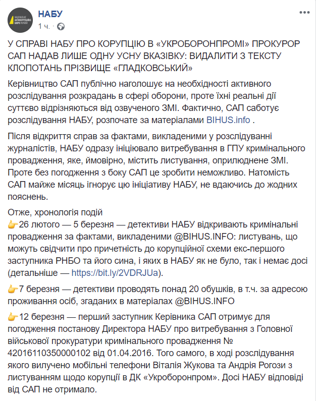 "Процессуальными руководителями в уголовном производстве, открытом по публикациям BIHUS.info, не предоставлено ни одного указания, кроме одного и то - в устной форме: не упоминать в ходатайствах детективов, которые направляются в суд, фамилии Гладковского О.В. и других лиц, опубликованных в журналистском расследовании", - сказано в сообщении.