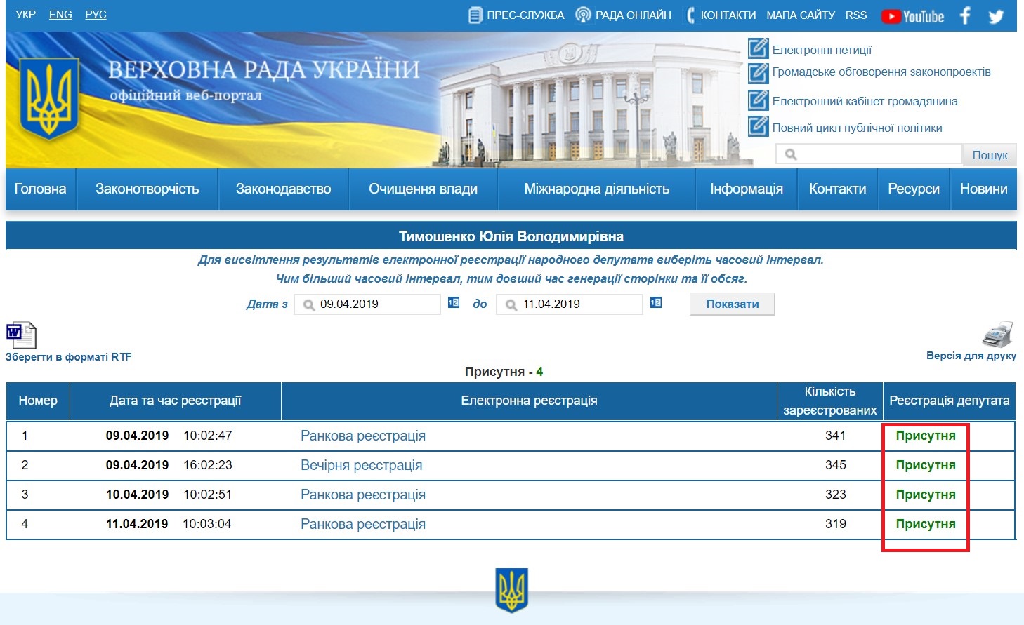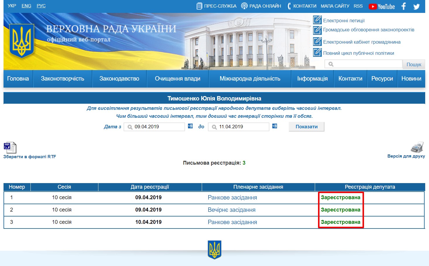 "Чесно" отмечает, что согласно данным сайта ВР, Тимошенко зарегистрирована на пленарные заседания 9 и 10 апреля, а также зарегистрирована письменно 11 апреля.