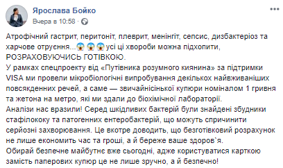 "Атрофический гастрит, перитонит, плеврит, менингит, сепсис, дисбактериоз и пищевое отравление... все эти болезни можно подхватить, рассчитываясь наличными", - добавила Бойко.