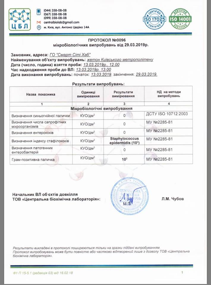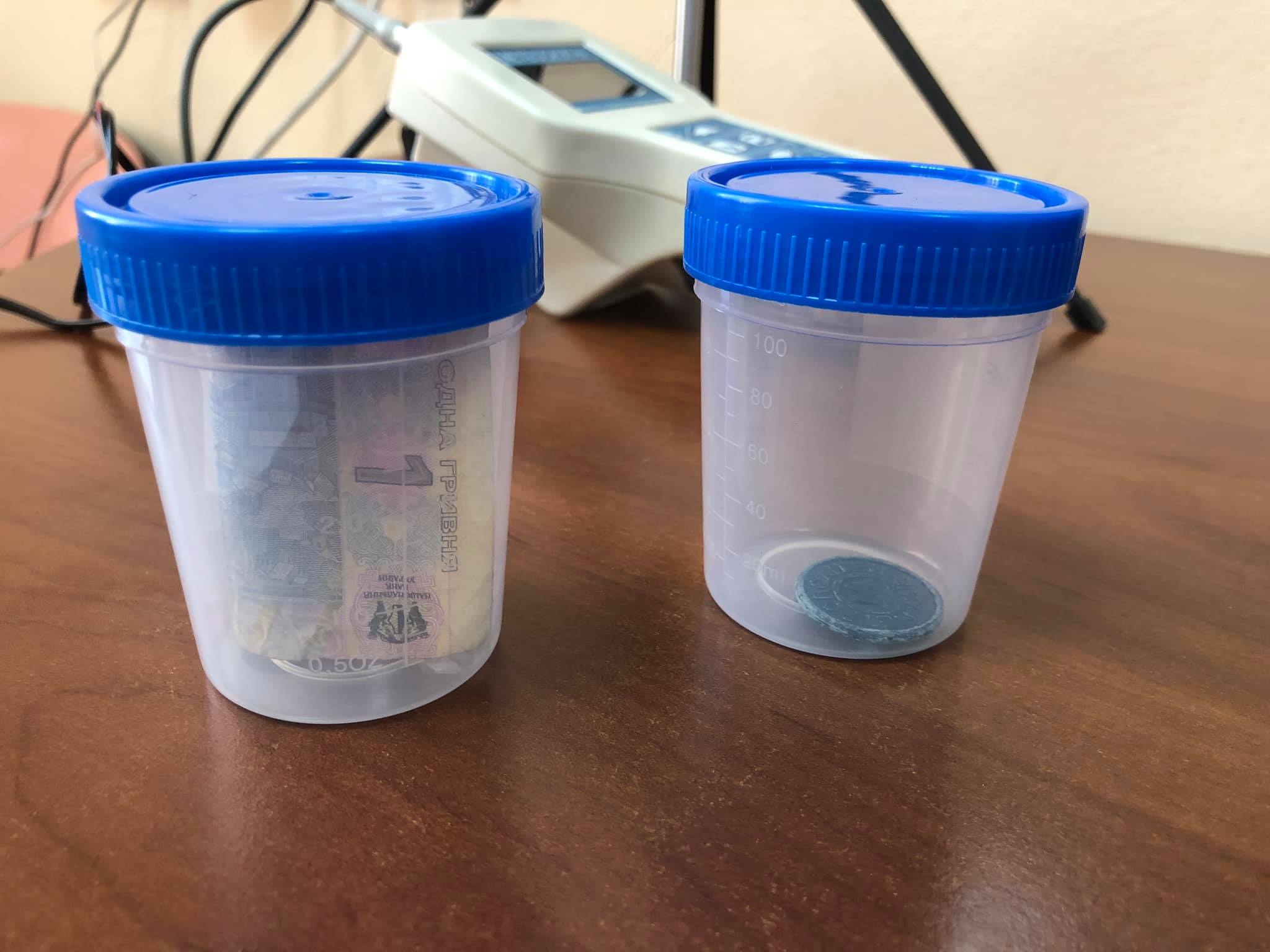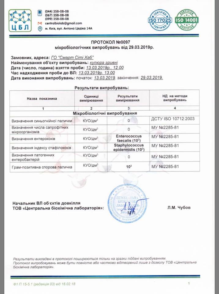 В сообщении говорится, что результаты исследования в биохимической лаборатории обыкновенной купюры номиналом 1 гривна и жетона метро, выявили на этих предметах  возбудителей стафилококка и патогенных энтеробактерий.