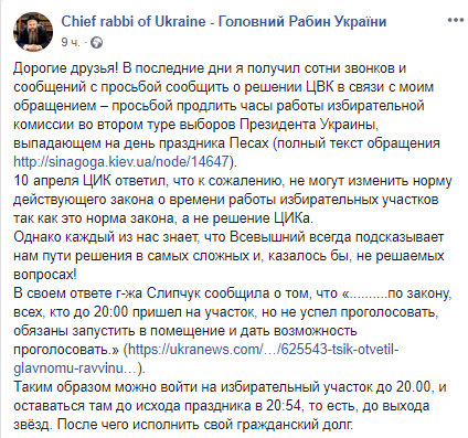 "В своем ответе г-жа Слипчук сообщила о том, что "..........по закону, всех, кто до 20:00 пришел на участок, но не успел проголосовать, обязаны запустить в помещение и дать возможность проголосовать". Таким образом можно войти на избирательный участок до 20:00, и оставаться там до исхода праздника в 20:54, то есть, до выхода звезд. После чего исполнить свой гражданский долг", - написал главный раввин Украины.