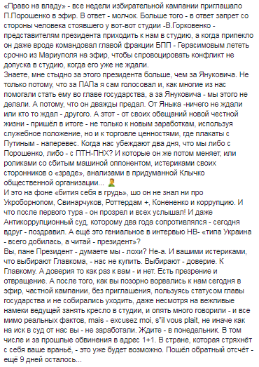 "Эфир "Право на владу". Все как обычно - приглашены гости, не кандидаты(!), эксперты, с разных сторон. И вдруг, за пару минут до эфира, появляется представитель АП - Горковенко возле ворот студии. Начинает светскую беседу с администратором. И тут без мигалок и охраны во двор госстудии Довженко подъезжают две машины и выходит сам президент.