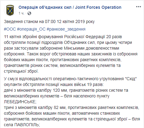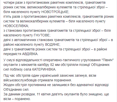 В четверг, 11 апреля в ООС зафиксированы обстрелы из минометов калибра 120-мм, гранатометов различных систем и крупнокалиберных пулеметов - у Лебединского; трижды из минометов калибра 82-мм, противотанковых ракетных комплексов, вооружения боевых машин пехоты, автоматических станковых гранатометов, крупнокалиберных пулеметов и стрелкового оружия - у Павлополя; четыре раза из противотанковых ракетных комплексов, гранатометов различных систем, крупнокалиберных пулеметов и стрелкового оружия - у Новотроицкого; пять раз из противотанковых ракетных комплексов, гранатометов различных систем и крупнокалиберных пулеметов - у Новоселовки; из станковых противотанковых гранатометов и стрелкового оружия - у Гнутово; дважды из автоматических станковых гранатометов и стрелкового оружия - в районе Водяного; дважды из гранатометов различных систем и стрелкового оружия - в районе пригорода Авдеевки.