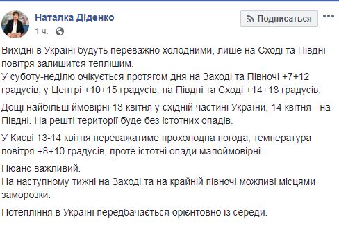 Выходные, 13 и 14 апреля, в Украине будут преимущественно холодными, только на востоке и юге воздух будет теплее. Об этом сообщила синоптик Наталья Диденко в Facebook.