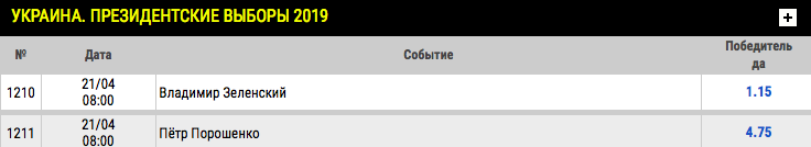Хотя еще в среду, 10 апреля, речь шла о ставке на действующего президента 3.50. При ставке 100 гривен прибыль составляет 250 гривен.
