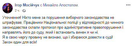 "Я вину не признаю, и буду отстаивать свою правоту в суде, но как законопослушный гражданин составления админпротокола не избегал!", - прокомментировал пост Апостола в соцсети Мосийчук.