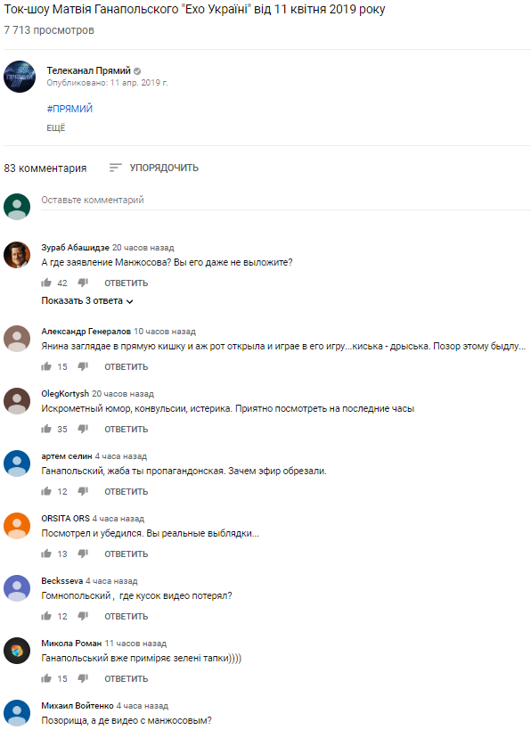 На это обратила внимание блогер Ольга Шарий. Также под самим видео пользователи YouTube оставили множество комментариев с вопросами, почему фрагмента с Манжосовым нет в записи шоу. Отметим, телеканал "Прямой" связывают с Петром Порошенко, чей штаб активно распространяет слухи о якобы наркозависимости "Слуги народа".
